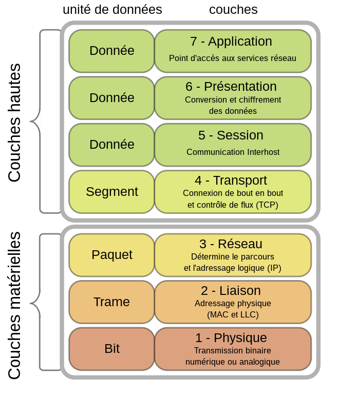Le modèle OSI (Open Systems Interconnection) est le standard utilisée pour expliquer le fonctionnement des réseaux de communication. Il est composé de sept couches, chacune ayant un rôle précis dans le processus de transmission et réception de données sur un réseau.